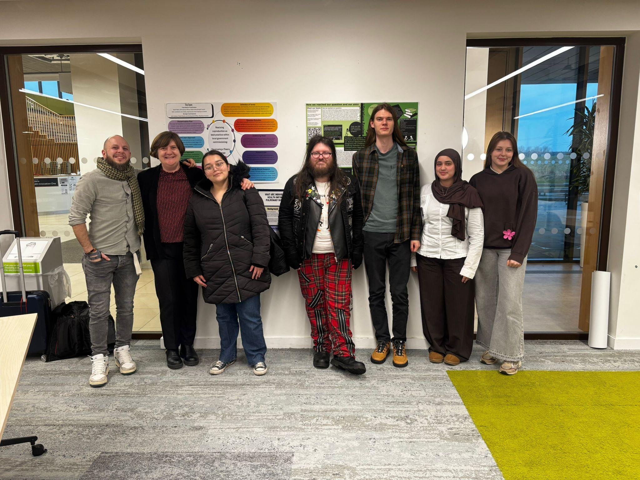 From left to right: Cy Karoonian (Project Co-ordinator Boingboing Foundation) Sharon Hird (co-researcher Healthwatch Blackpool) Keira Pool (Co-researcher Boingboing Foundation) Matthew Parker (Senior Co-researcher Healthwatch Blackpool) Vladystav Basiuk (co-researcher Boingboing Foundation) Sumaiyah Chowdhury (Co-researcher Boingboing Foundation) Kelsey Rogers (co-researcher Boingboing Foundation)
